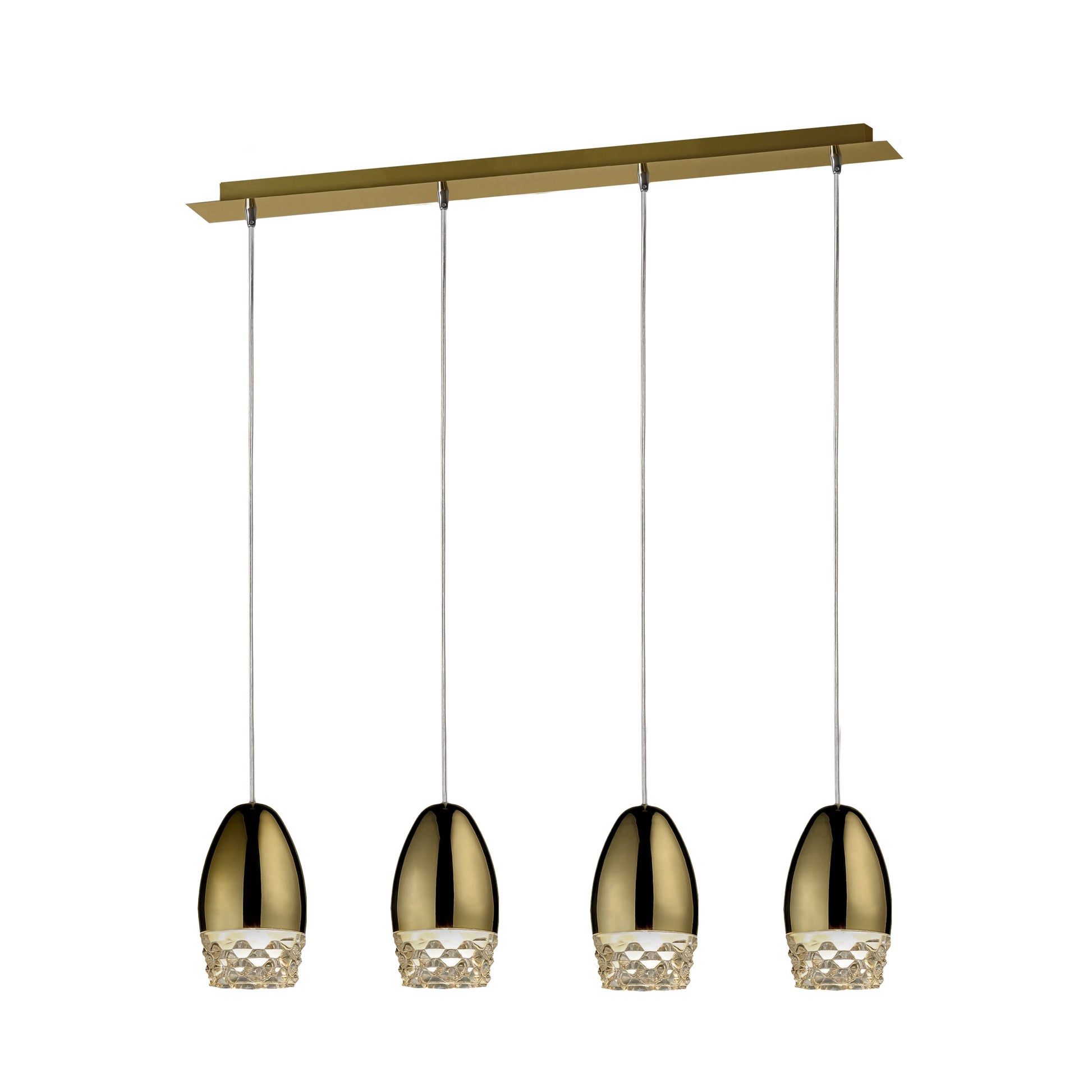 Lampe 4 lumières, réalisée en métal finition or. Tulipes en verre moulé. Réglable en hauteur.