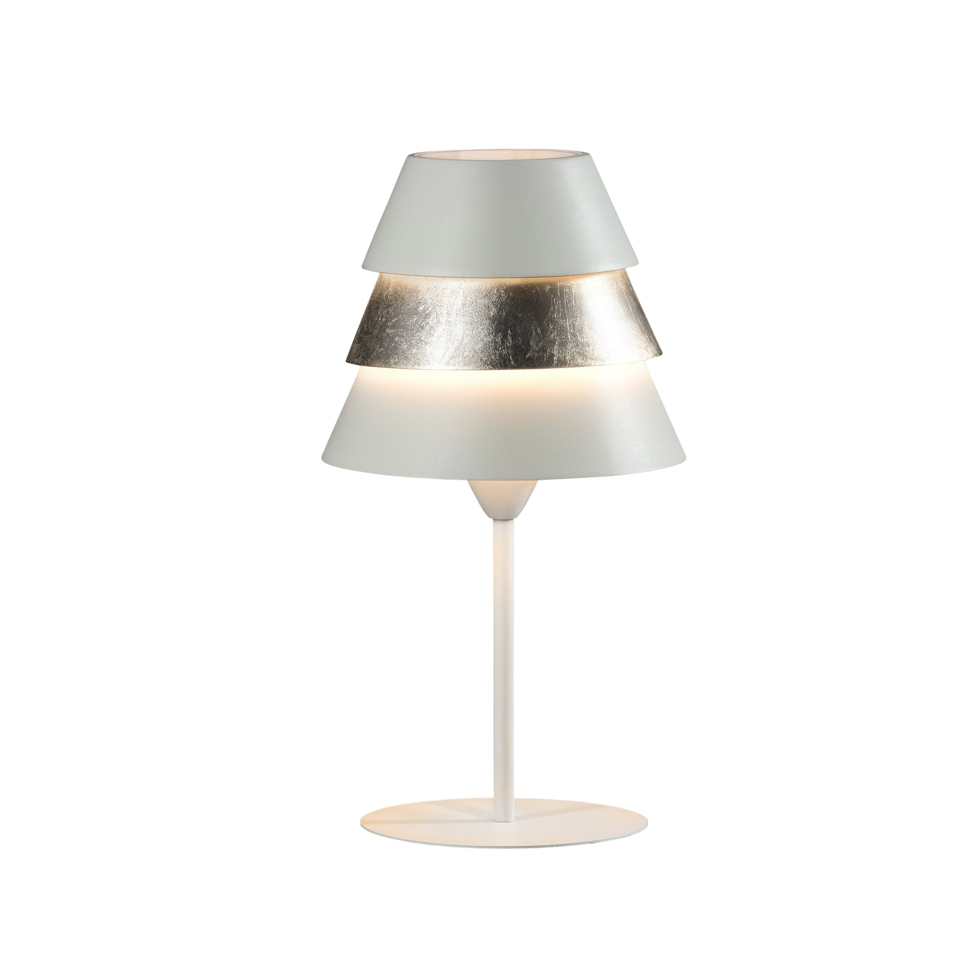Lampe de table 1 lumière réalisée en métal laqué. Abat-jour métallique finition blanc cassé mat et argent. Diffuseur acrylique.