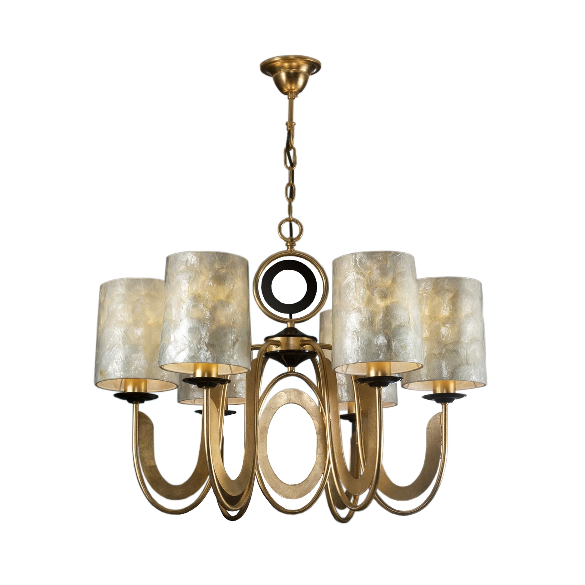 Lampe à 6 lumières en métal finition FEUILLE D’OR et détails en laque noir brillant. Abat-jours coniques avec applications en nacre. DIMMABLE. Télécommande incluse.