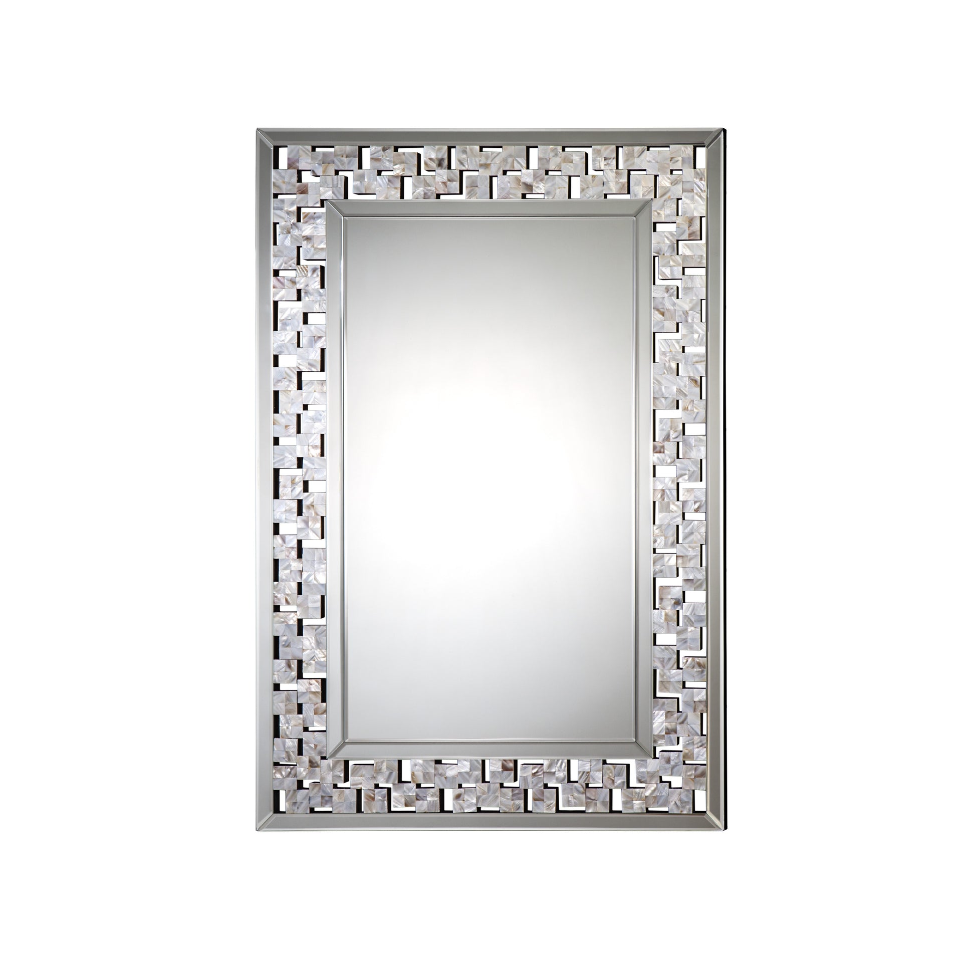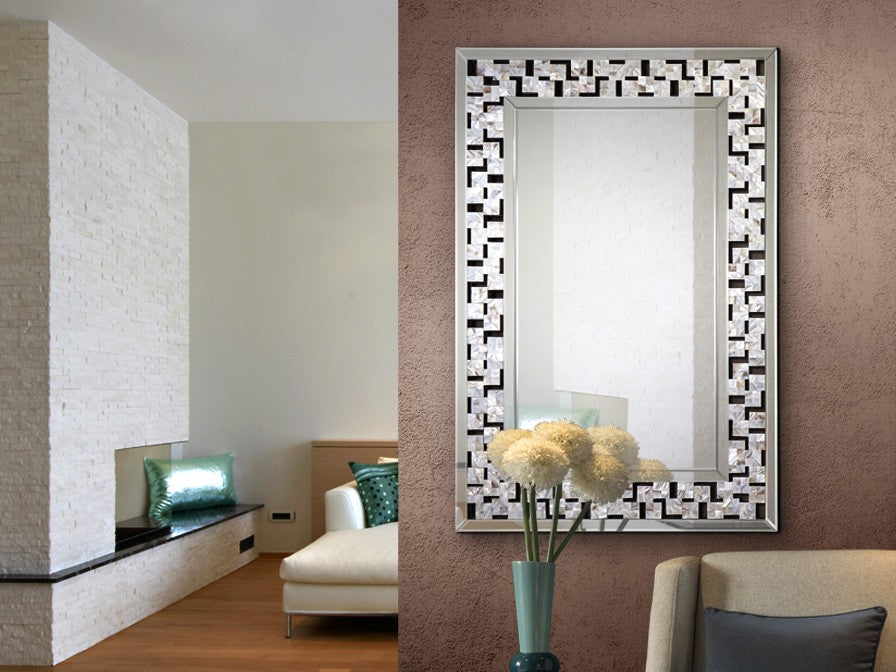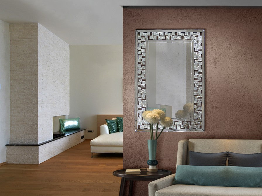 Miroir rectangulaire avec glace centrale biseautée. Cadre réalisé avec pièces de nacre. Dos en DM finition en noir. Préparé pour être suspendu en position horizontale ou verticale.