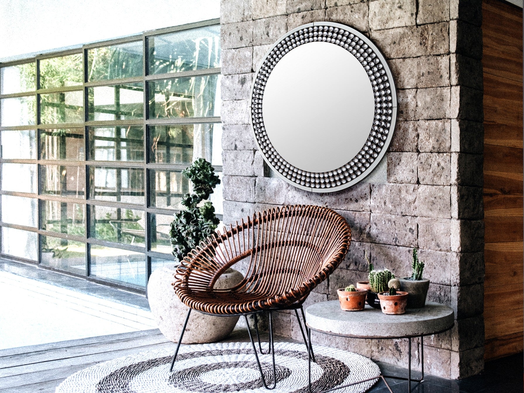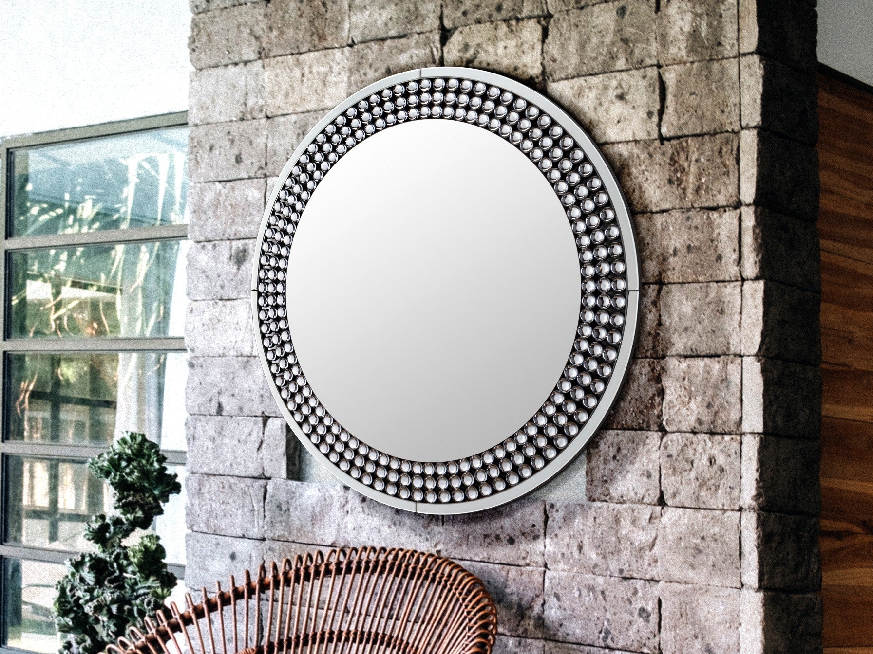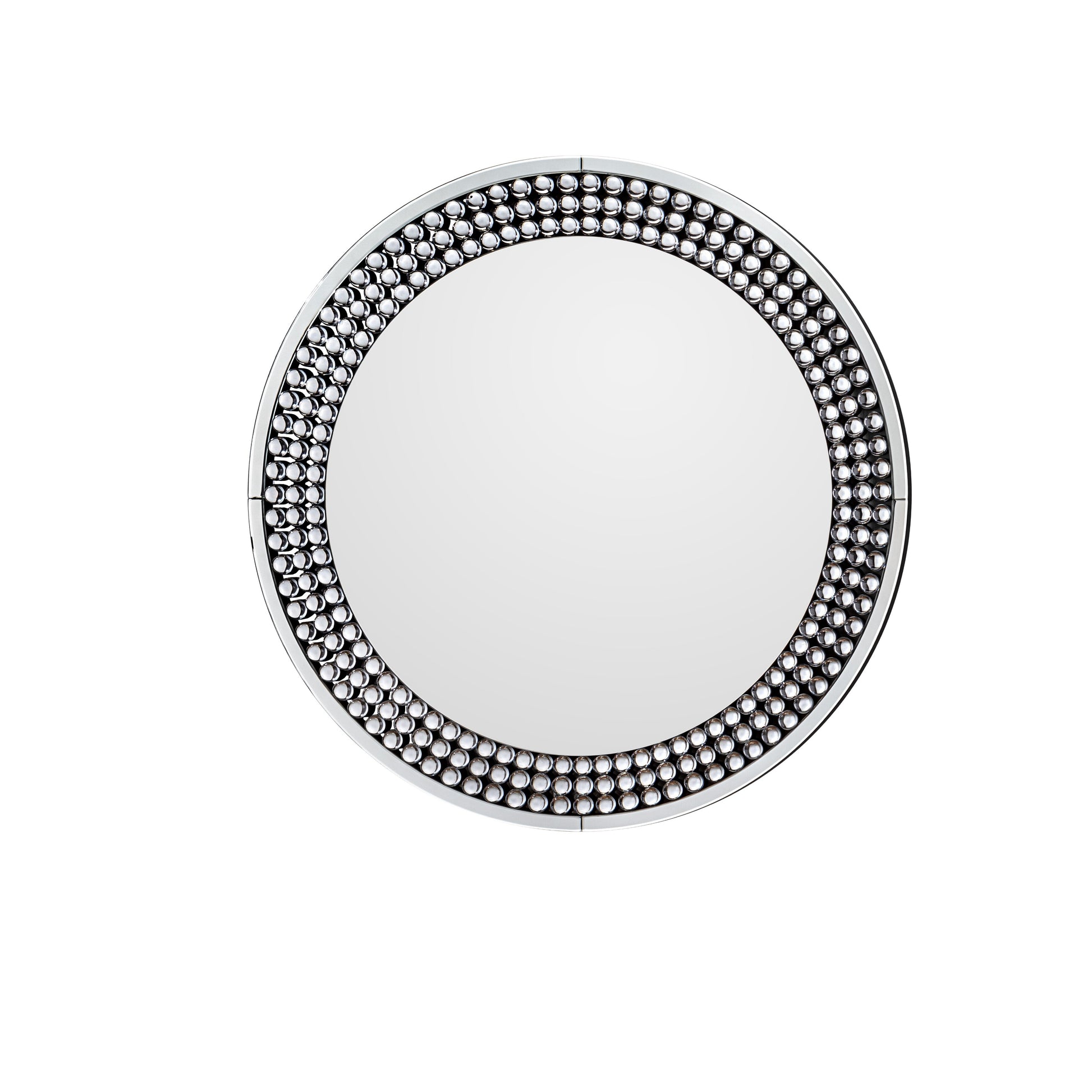Miroir rond avec glace centrale. Cadre ajouré réalisé avec des sections de glace biseautées et intérieur avec demi-sphères en verre en forme de grecque. Dos en DM finition de couleur noire.